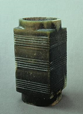 玉琮(编号总0128:1)高4~4.2厘米,外方边长6.1~6.3厘米,内径5.2厘米,上端射较长,下端射极短,形制原始古朴,切割改制的现象明显。