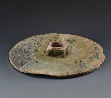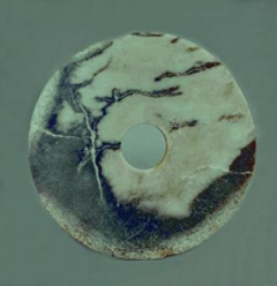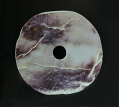 玉璧(编号总0129:5)直经9厘米,单面钻孔,大端孔径4.4厘米,小端孔径4厘米,厚度0.55—0.7厘米,璧外缘有磕碰痕。