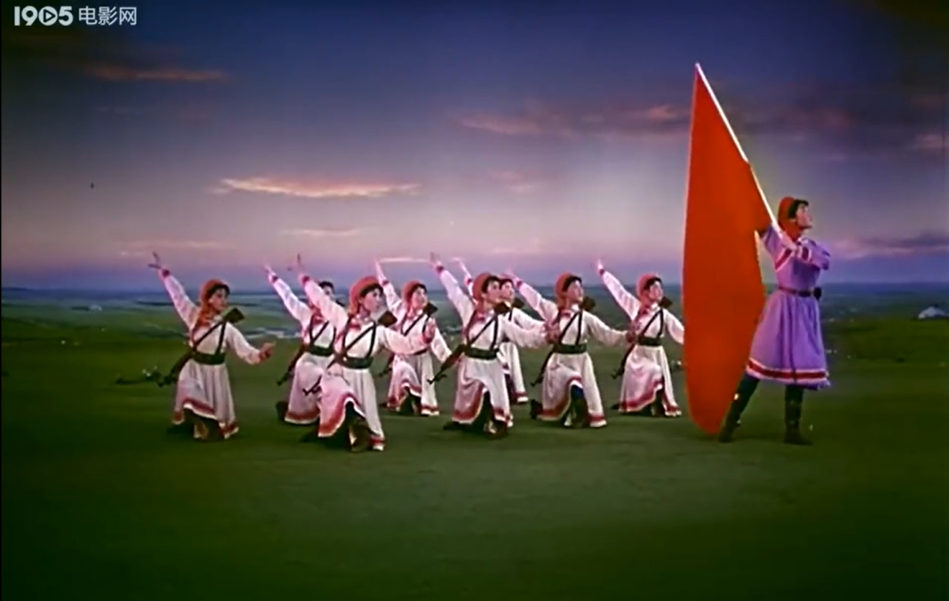 《草原女民兵》最初作为舞台舞蹈,其美学特质建立在现场性、即时性与三维空间性之上。而当它通过《百花争艳》的镜头被重新诠释时,经历了一场深刻的美学转换。电影不仅记录了这一舞蹈,更通过其特有的语言系统,对舞蹈进行了二次创作与美学升华。