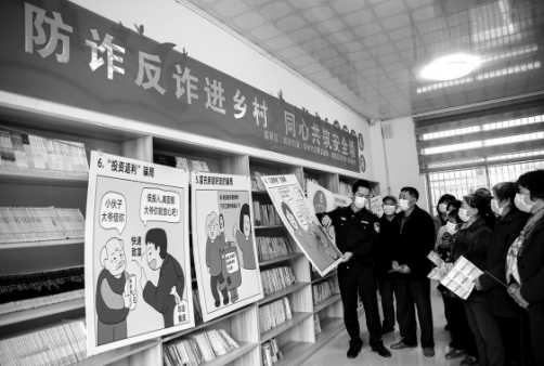 图为在杨花桥村农家书屋内,民警向老人宣传电信诈骗、养老诈骗等防诈知识,提升农村老人识骗能力。