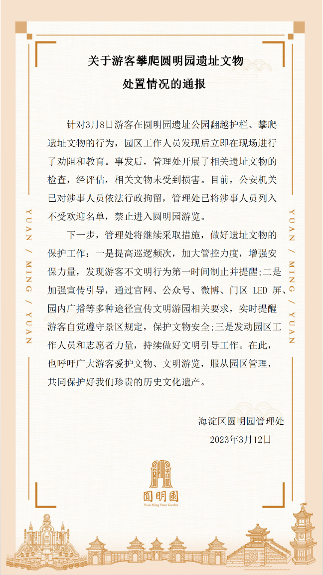 《通报》指出,针对3月8日游客在圆明园遗址公园翻越护栏、攀爬遗址文物的行为,园区工作人员发现后立即在现场进行了劝阻和教育。事发后,管理处开展了相关遗址文物的检查,经评估,相关文物未受到损害。目前,公安机关已对涉事人员依法行政拘留,管理处已将涉事人员列入不受欢迎名单,禁止进入圆明园游览。