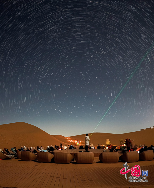 在沙漠区,游客晨观大漠日出,昏赏沙海夕阳,夜晚宿在星星酒店,感受躺在床上看星星的奇妙体验,在星咖啡手工制作星星原木版画,在五行沙疗室滋养生命的每一个细胞,在观星谷跟着星空讲师春看狮子座、夏观银河、秋寻仙女座、冬追猎户座,期待与一场流星雨的不期而遇。